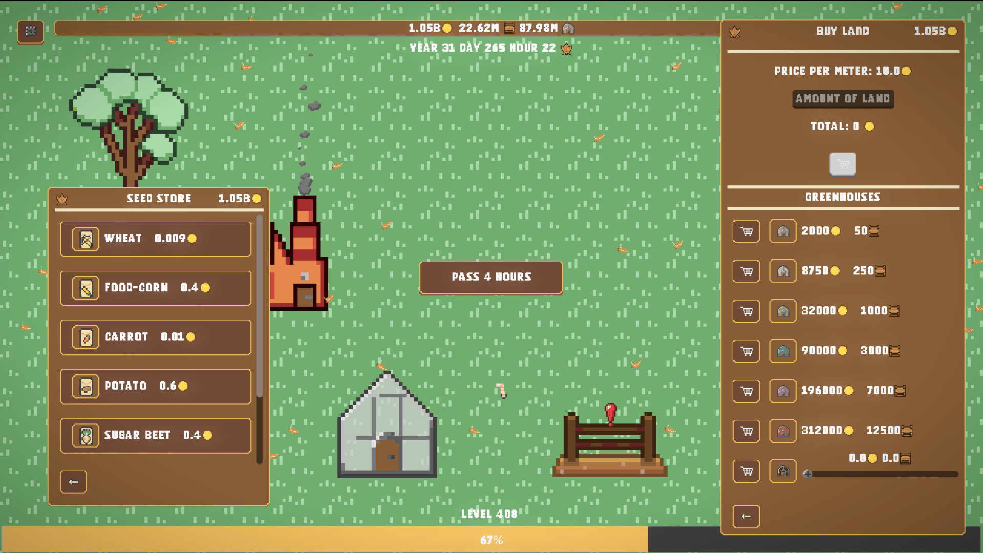 Plant crops, manage the passing seasons, and slowly expand your farm. Unlock new mechanics like fruit trees that grow every year, random weather events such as rain that boosts crop growth, and rare winter traders that sell special seeds.